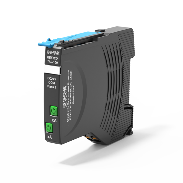 Der zweikanalige elektronische Sicherungsautomat REX12D schütz die Anlage bei Überstrom und Kurzschluss. Er schaltet den betroffenen Stromkreis sicher ab und verhindert dadurch Spannungseinbrüche an der DC 24 V-Stromverteilung.