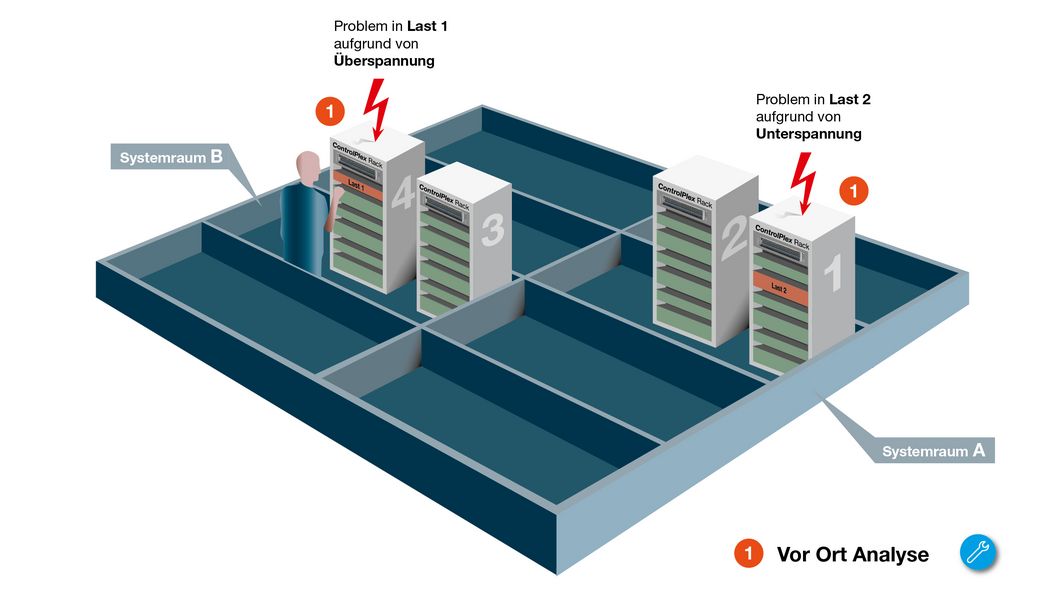 Das ControlPlex® Rack sichert mit den elektronischen Schutzschaltern ESX300-S die angeschlossenen Lasten gegen Über- und Kurzschlussströme. Damit verhindert das System zuverlässig die Zerstörung von Elektronikbaugruppen oder Lastleitungen. Die integrierte elektronische Strombegrenzung des ESX300-S verhindert, dass im Kurzschlussfall hohe Ströme fließen, die einen unerwünschten Spannungseinbruch der Stromversorgung verursachen. Tritt in einem Verbraucher (siehe Beispiel Last 1 und Last 2) der Anlage ein Fehler auf, wird dank der selektiven Abschaltung nur diese Last abgeschaltet und mitversorgte, fehlerfreie Geräte bleiben in Betrieb.