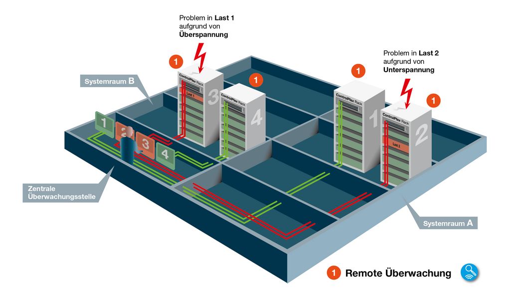 Die Kombination aus ControlPlex® Rack, ESX300-S und RSI10 ist der Einstieg in die transparente Überwachung der angeschlossenen Verbraucher. Das RSI10 kommuniziert über einen internen Bus mit allen im ControlPlex Rack installierten Sicherungsautomaten. Sollte einer der Sicherungsautomaten aufgrund von Überspannung, Überstrom etc. den zu versorgenden Verbraucher abschalten, signalisiert das RSI10 diesen Status über eine potentialfreie Gruppensignalisierung extern z.B. an einem Überwachungssystem. So können sowohl bei Insellösungen wie auch bei zentral überwachten Anlagen Sofortmaßnahmen zur Behebung der Störung eingeleitet werden.